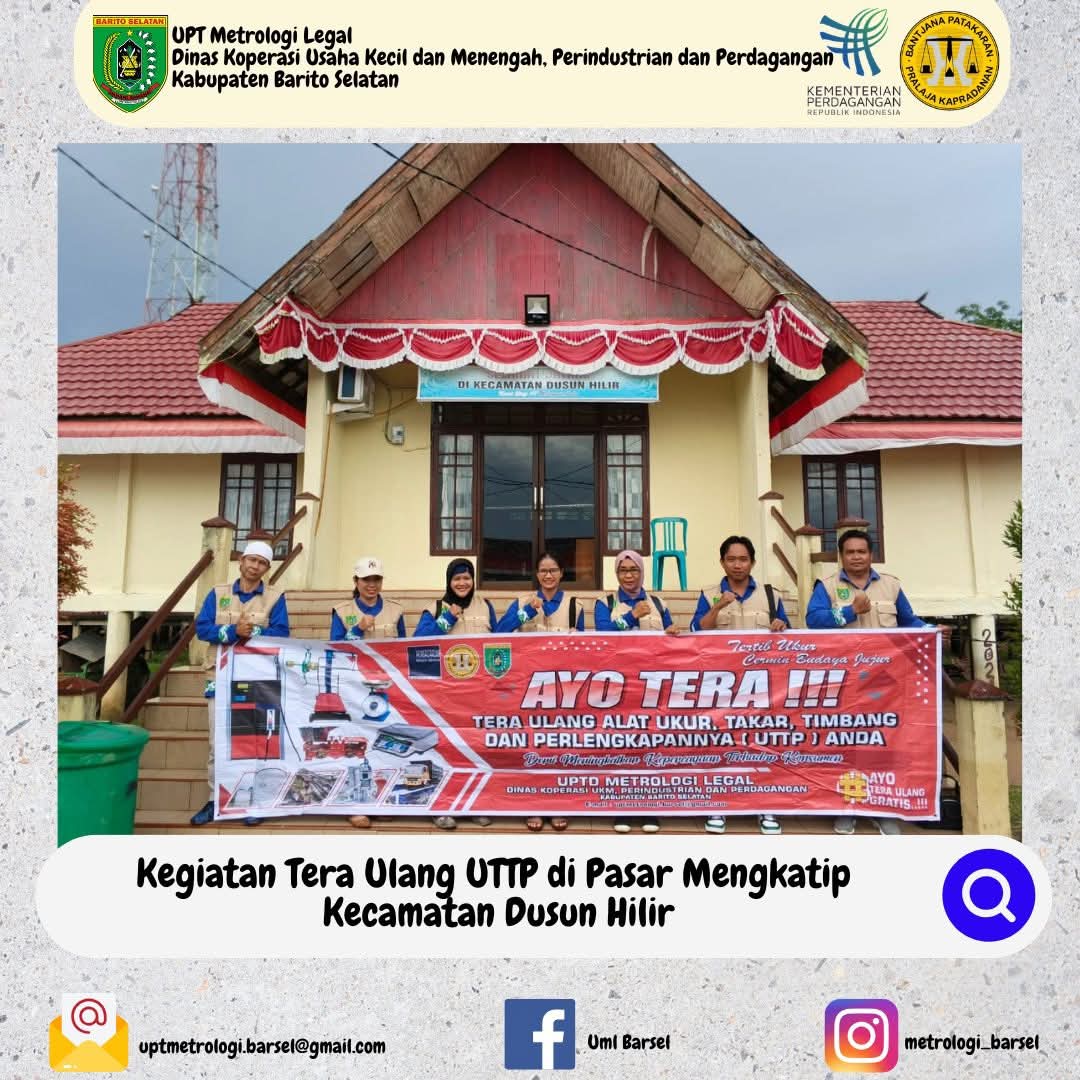 Pada bulan Februari 2026 Unit Metrologi Legal Kab. Barito Selatan melakukan kegiatan Tera Ulang UTTP (Alat Ukur, Takar, Timbang, dan Perlengkapannya) milik para pedagang di Pasar Jenamas Kecamatan Jenamas..Kegiatan ini rutin dilaksanakan SATU KALI dalam SETAHUN. Perlu diketahui bahwa timbangan yang sering kita temui seperti timbangan meja/timbangan itik, timbangan pegas, timbangan elektronik yang digunakan sehari-hari untuk transaksi jual beli di pasar WAJIB ditera ulang setiap tahunnya guna menjamin kebenaran hasil pengukuran sehingga pihak pedagang/pelaku usaha dan pembeli/konsumen tidak ada yang merasa dirugikan.. Diharapkan dengan adanya kegiatan tera ulang UTTP ini dapat meningkatkan kesadaran para pedagang/pelaku usaha untuk rutin mengajukan tera/tera ulang UTTP yang mereka miliki..- Untuk pengajuan tera/tera ulang UTTP silahkan datang ke kantor UML Kab. Barito Selatan di Jl. RA Kartini, Kelurahan Jelapat, Buntok.