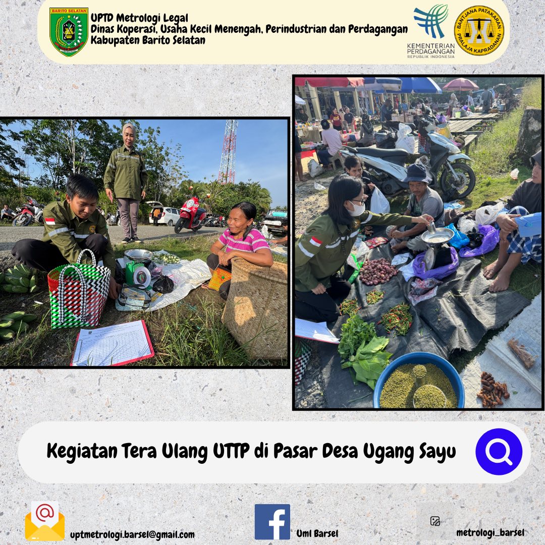 Pada tanggal 14 September 2025 Unit Metrologi Legal Kab. Barito Selatan melakukan kegiatan Tera Ulang UTTP (Alat Ukur, Takar, Timbang, dan Perlengkapannya) milik para pedagang di Pasar Desa Ugang Sayu Kecamatan Gunung Bintang Awai..